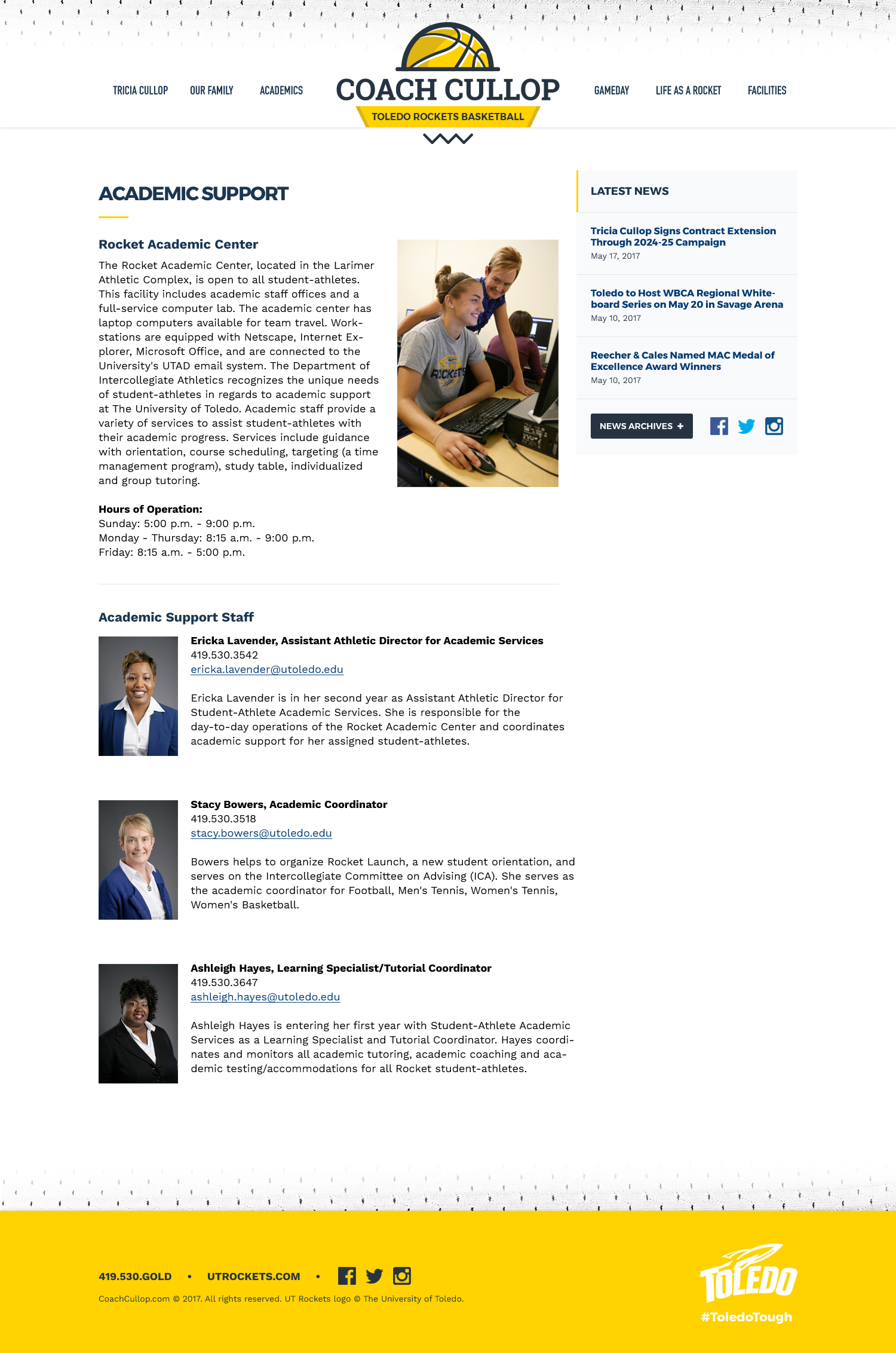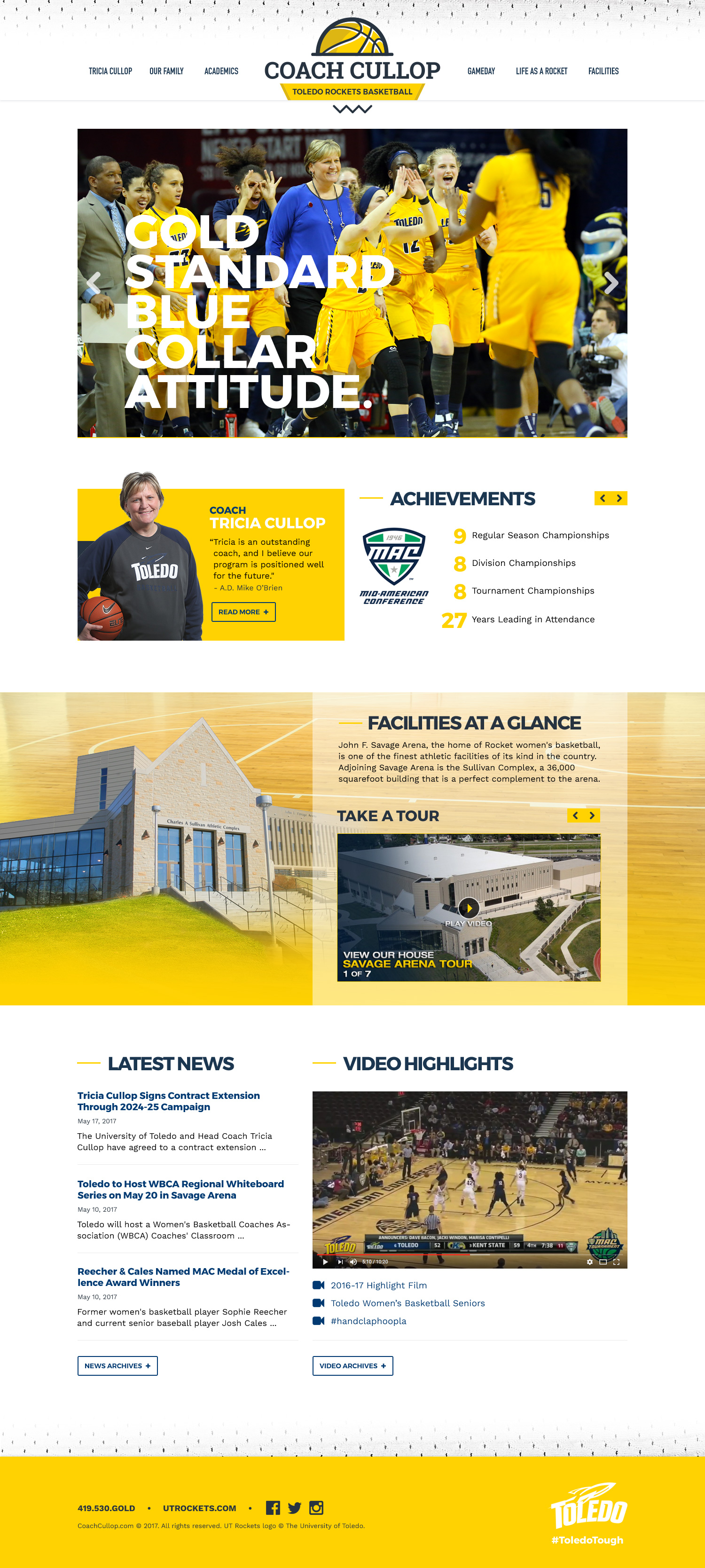 Website for The University of Toledo Women's Basketball Coach Tricia Cullop. Allows easy access to highlight videos, tour videos and more. The coaching staff are able to use the website while on their recruiting trips to help give potential players a chance to see what the program and facilities can offer.