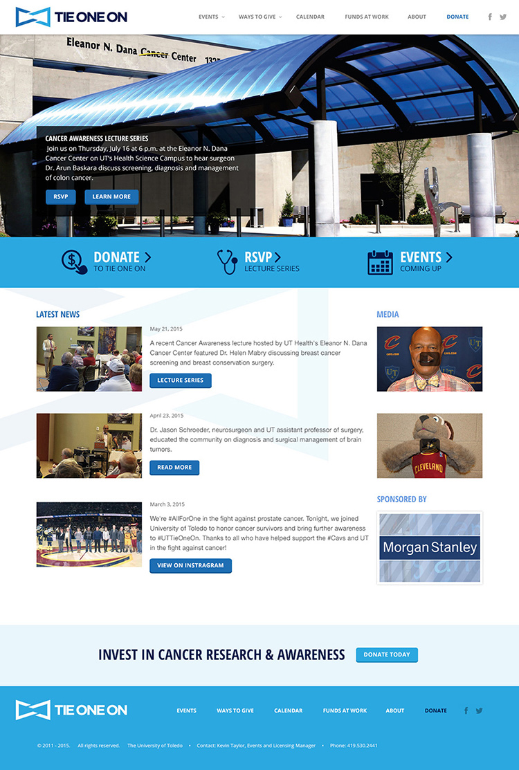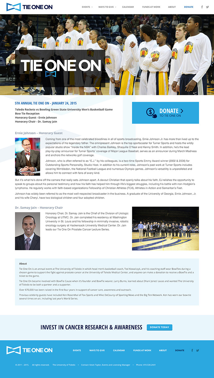 Microsite for annual The University of Toledo's Tie One On event. The Tie One On event raised donor contributions at the UT Men's Basketball game for the fight against prostate cancer, as well as helped launch a cancer awareness lecture series.