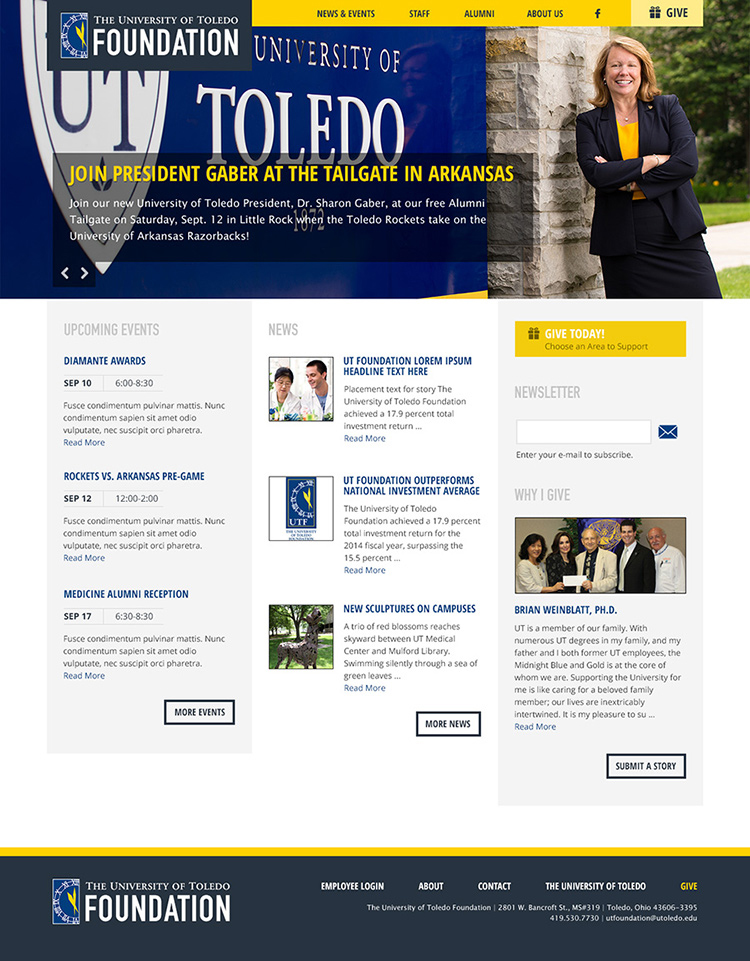 Website for The University of Toledo's Foundation. The redesigned website features a large rotating hero image, RSS feed of Events and News, a rotating Donor story, and a focus on the Give Today call-to-actions.