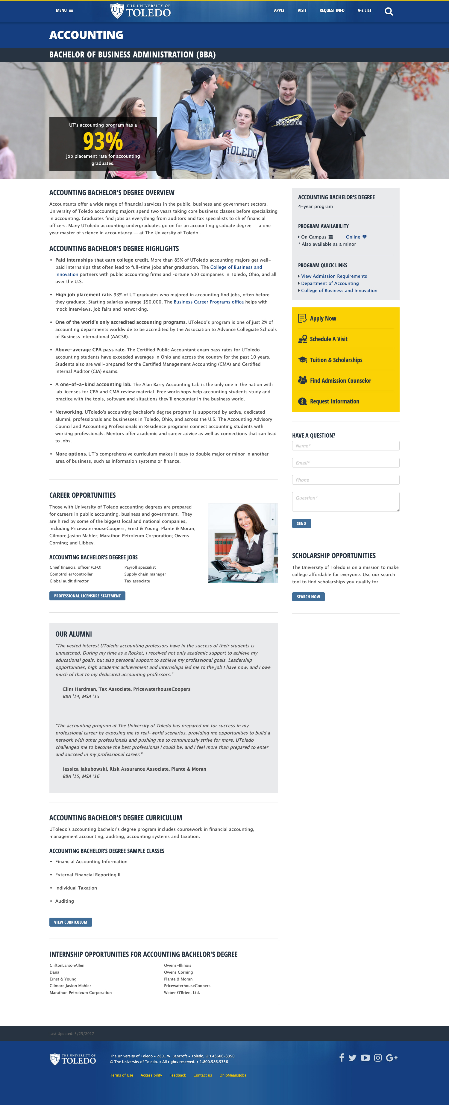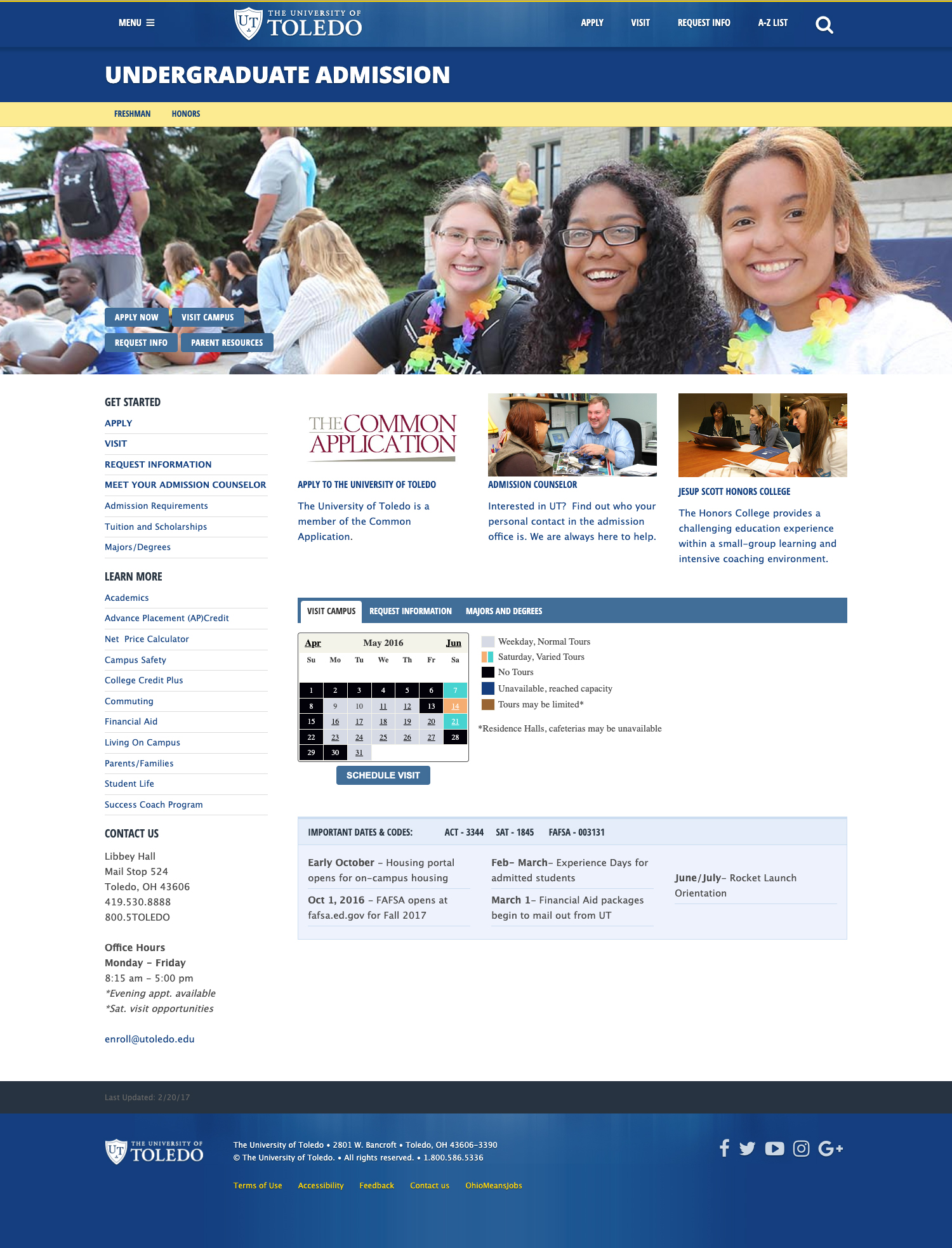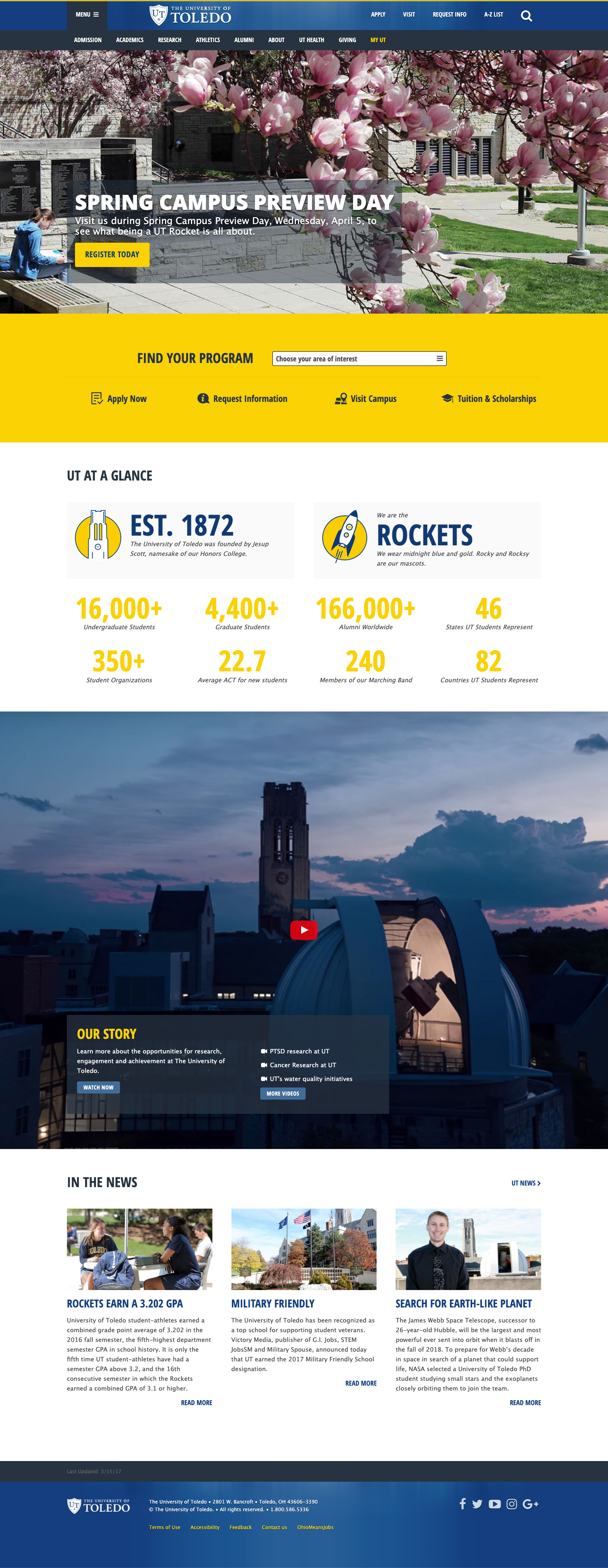 A responsive redesign of the entire utoledo.edu website utilizing fluid percentages for widths and adaptive media queries to target specific device sizes. Various interior templates were also created for the 400+ users within the CMS, Omni Update.