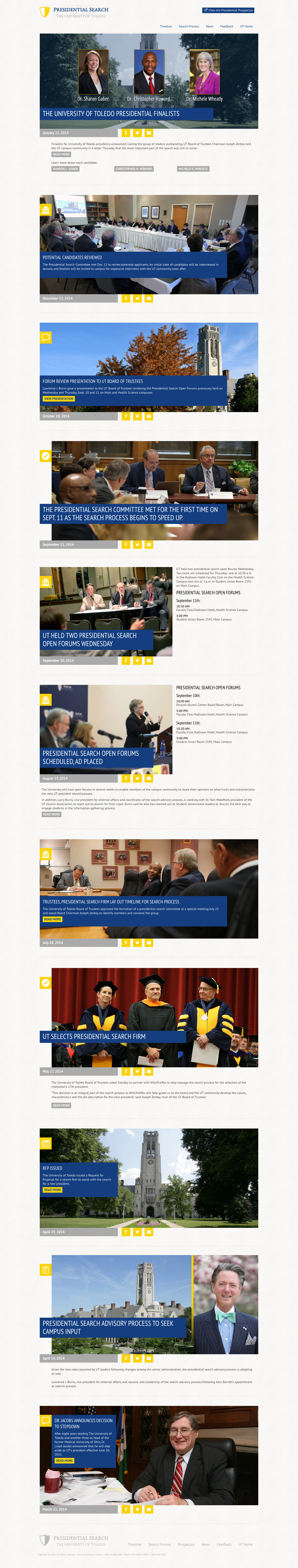 Microsite set up for The University of Toledo's Presidential Search. The website was timeline based, a user could navigate to specific spot within the timeline, or scroll through the entire sequece of events. Website was set up to show transparency of UT's efforts in searching for a new university president.